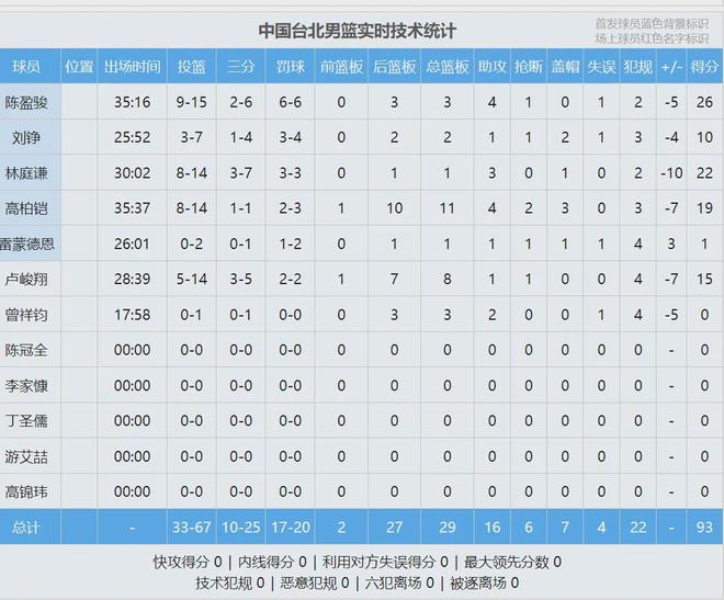 陈盈骏26分3板4助、林庭谦22分3助、高柏铠19分11板4助2断3帽、卢峻翔15分8板。最后看看数据,说说你的感受: