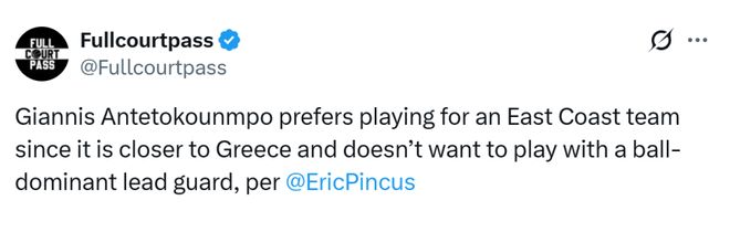 Pincus在文中指出,字母哥更偏爱东海岸,那里距离希腊更近(无论是飞行距离还是时区)。有人称,字母哥怀念和霍勒迪、米德尔顿搭档的日子,那是他2021年夺冠的队友。这并不意味着他想重组当年阵容,只是字母哥不希望和大量持球的核心控卫搭档,他更想成为球队进攻的绝对发动机(霍勒迪和米德尔顿都能无球配合他)。