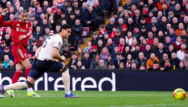 利物浦获得角球,萨拉赫主罚,埃基蒂克助攻,麦卡利斯特劲射破门,利物浦已经3球领先了。