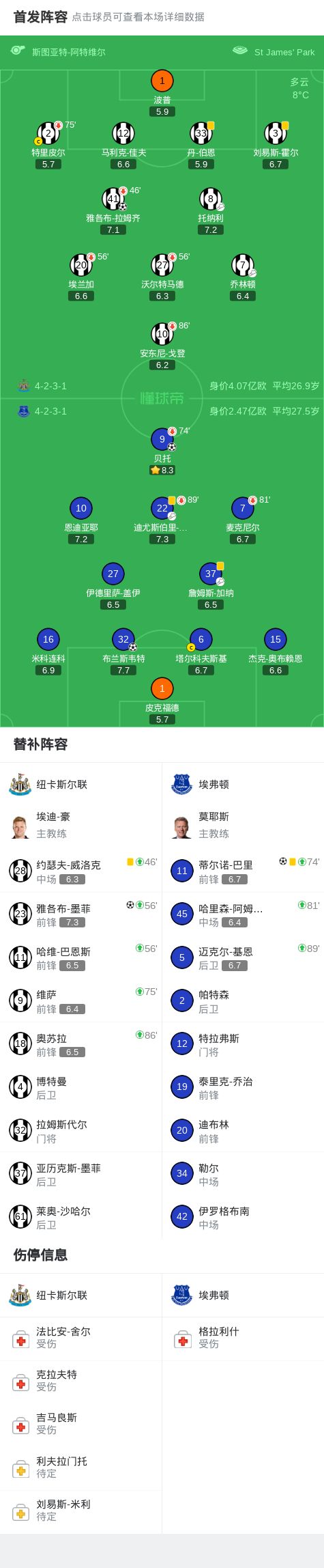 北京时间2月28日英格兰足球顶级联赛 联赛 第28轮,纽卡斯尔联主场对阵埃弗顿。纽卡斯尔联雅各布-拉姆齐破门,雅各布-墨菲破门。埃弗顿布兰斯韦特破门,贝托破门,蒂尔诺-巴里破门。最终比分纽卡斯尔联 2-3 埃弗顿。