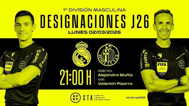 西班牙足协官方公布了周一西甲比赛裁判安排,亚历杭德罗-穆尼斯将执法皇马vs赫塔费。