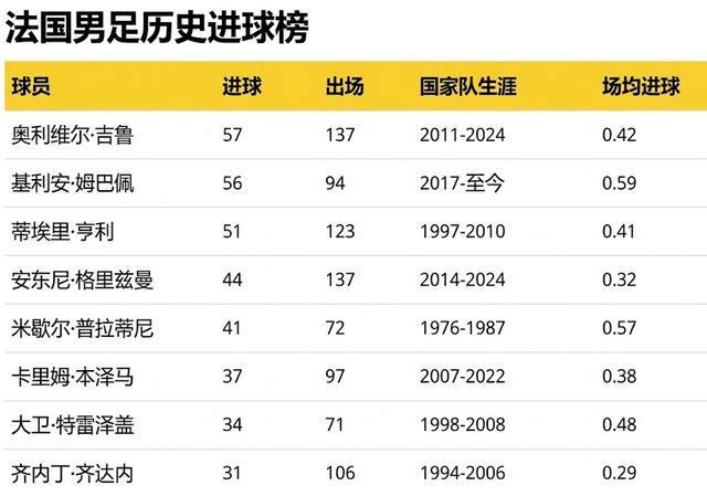 姆巴佩距法国队史射手王就差1球,吉鲁的纪录快保不住了!