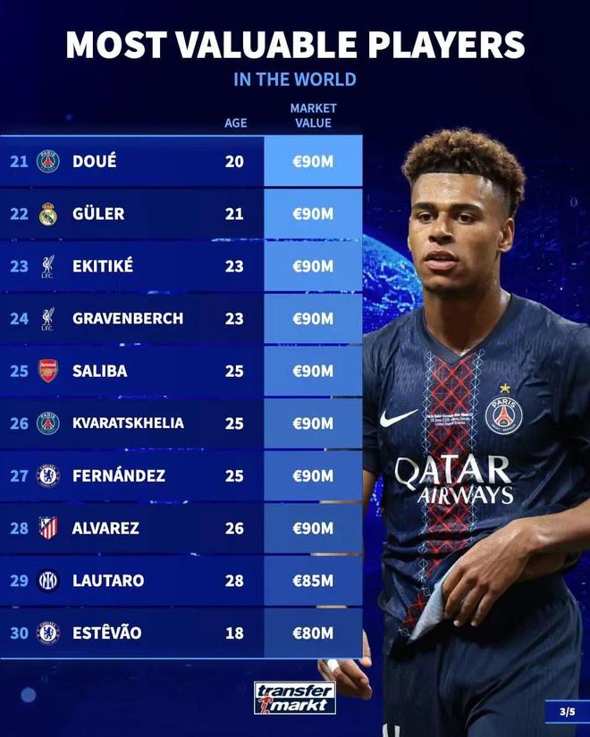 其中西甲联赛球员中,身价最高的为亚马尔、姆巴佩,他们的身价均为2亿欧,英超联赛身价最高的球员则是哈兰德,他目前的身价也是2亿欧,德甲联赛身价最高的球员为目前效力于拜仁的奥利塞,他的身价为1.4亿欧,法甲联赛身价最高的是效力于巴黎的内维斯,他目前身价为1.1亿欧。意甲方面,身价最高的是来自国米的劳塔罗,他目前身价为8500万欧,排在这份榜单第29的位置。