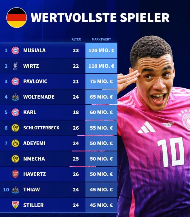 德转列德国球员身价前10:穆西亚拉1.2亿第1,维尔茨1.1亿第2