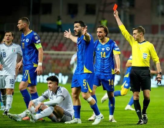据报道,在与波黑的附加赛决胜局中,意大利在点球大战中失利,连续第三次无缘世界杯,巴斯托尼在第41分钟因对梅米奇的犯规被直接红牌罚下,使得他的球队在整个下半场和加时赛中都少一人。