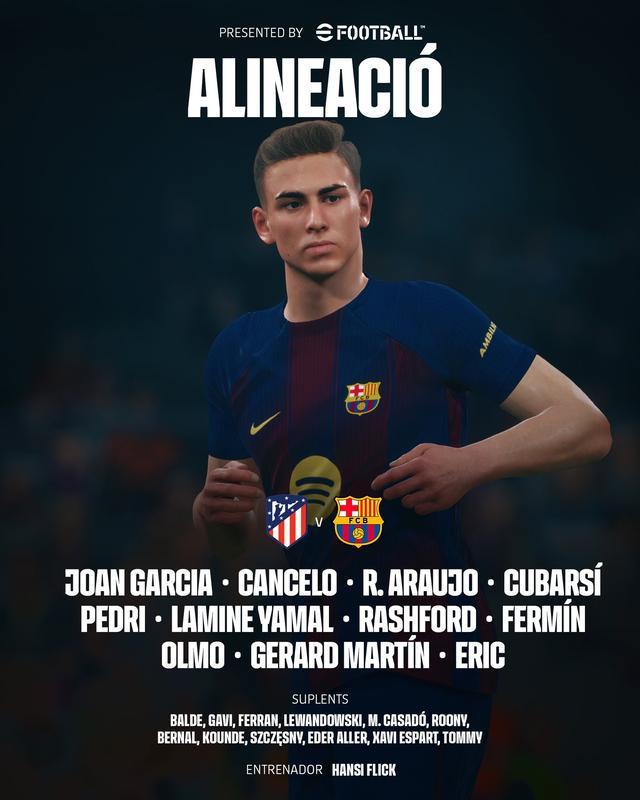 巴塞罗那首发:13-霍安-加西亚、24-埃里克-加西亚、4-阿劳霍、5-库巴西、18-赫拉德-马丁、2-坎塞洛、8-佩德里、16-费尔明-洛佩斯、20-奥尔莫、14-拉什福德、10-亚马尔