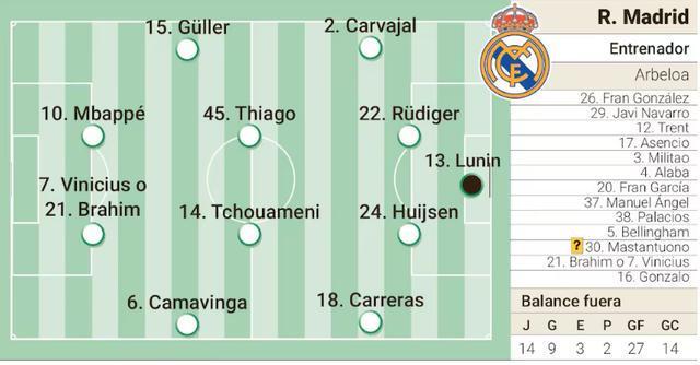 皇马客战马洛卡首发预测:维尼休斯姆巴佩联袂出场,巴尔韦德停赛