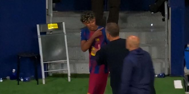 波兰人在第87分钟的进球点燃了所有巴萨球迷的热情,唯独拉明·亚马尔除外。这位19岁小将没有庆祝9号的进球,他的队友兼好友库巴西还凑到他耳边说了些什么。这位拉玛西亚青训营培养的前锋显然心事重重,这种情绪在终场哨响时爆发了。