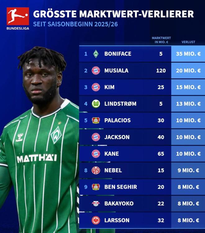 本赛季德甲身价跌幅榜:博尼费斯暴跌3500万第1,穆西亚拉第2