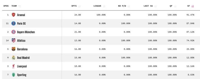 而在昨天首日2场对决中,拜仁客场2-1力挫皇马,阿森纳则在客场1-0击败了葡萄牙体育。首回合战罢,权威数据媒体OPTA更新了欧冠4强的最新概率。