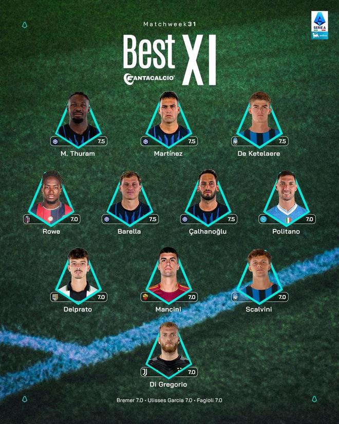 意甲第31轮最佳阵容:劳塔罗领衔国米4人,迪格雷戈里奥入选