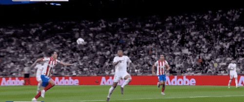 第42分钟,卡瓦哈尔边路传中,姆巴佩高高跃起头球摆渡,维尼修斯门前被动头球,错失良机。