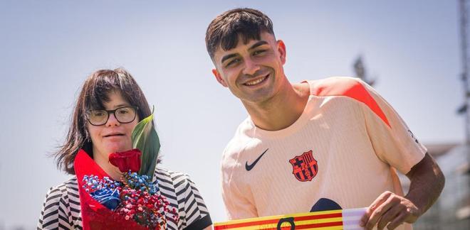 做公益,世体:佩德里与唐氏综合征女青年会面,双方交换礼物